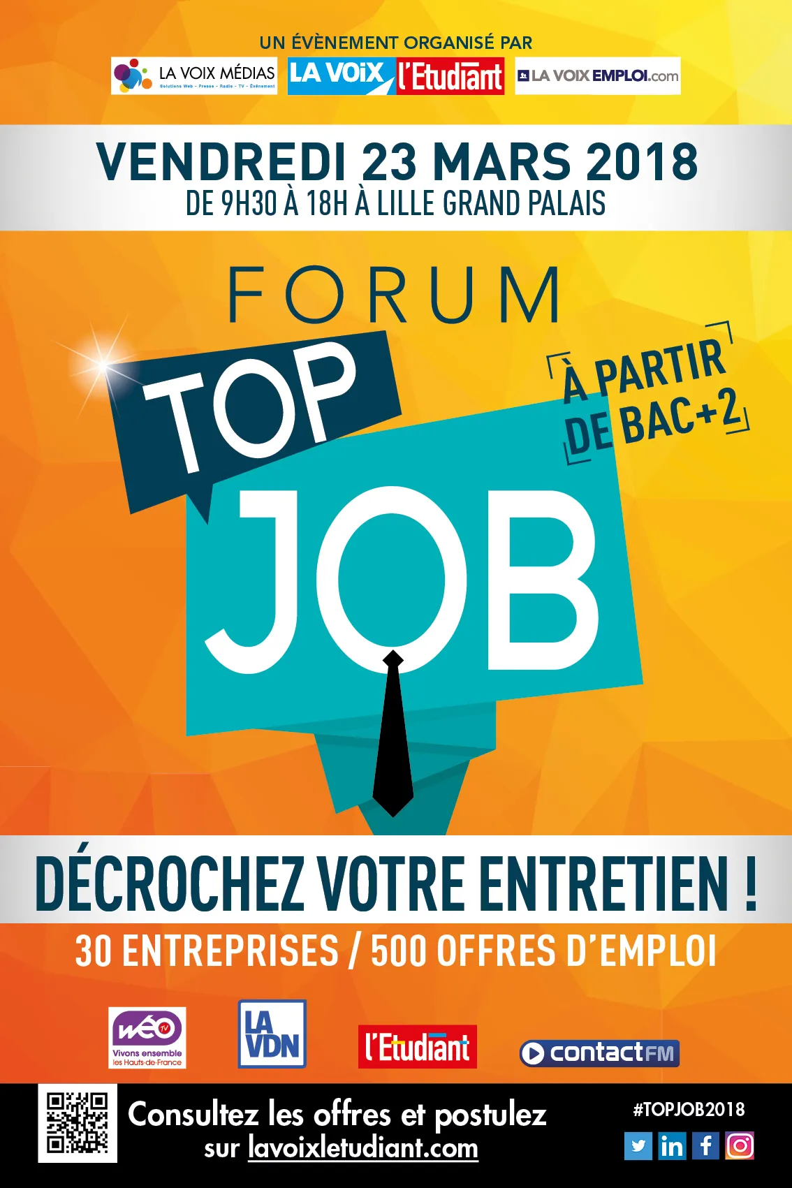 Forum Top Job - vendredi 23 mars, de 9h30 à 18h à Lille Grand Palais. Invitations sur la voixletudiant.com