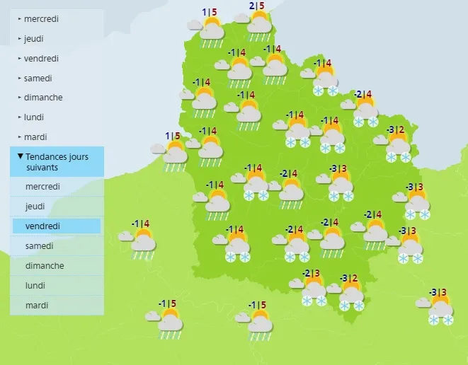 Puis, le mercure pourrait continuer à chuter en début de semaine prochaine et descendre dans le négatif (jusqu’à –3° dans l’Avesnois). Météo France n’exclut pas non plus un risque de chutes de neige pour mardi et vendredi (indice de 50%).