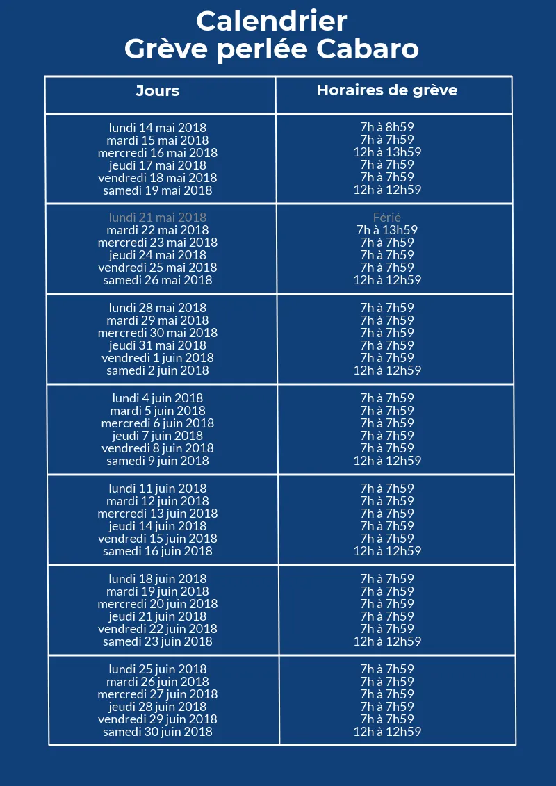Cabaro a diffusé le calendrier des horaires de grève, jour par jour, nous vous avons récapitulé cela pour vous permettre de vous organiser au mieux.