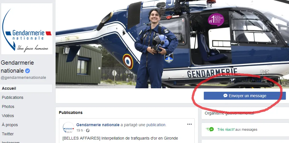 Désormais, vous pouvez contacter directement la gendarmerie, 7j/7 et 24h/24, sur sa page Facebook en cliquant sur le bouton “envoyer un message”, également sur Twitter. Vous pouvez aussi utiliser un tchat et le formulaire de contact sur le site officiel de la Gendarmerie