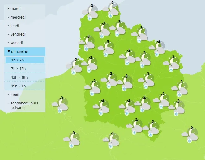 Dimanche, des averses de neige sont attendues sur le quart nord-est, et plus généralement sur une grande partie du pays lundi matin.