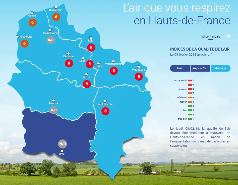 Les concentrations de particules fines vont augmenter et dépasser le seuil d'information et de recommandation. La qualité de l'air sera "mauvaise" dans le Nord, le Pas-de-Calais, et l’Aisne (un indice de 8 sur 10) ; « médiocre » sur la Côte d’Opale (6 sur 10).