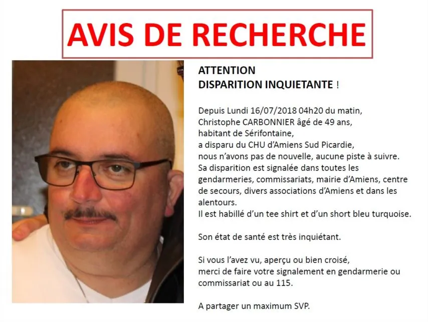 Les proches de Christophe Carbonnier sont rongés par l'inquiétude. Ils ont prévenu les autorités et ont décidé de lancer un avis de recherche. L’état de santé du disparu, habitant Sérifontaine dans l’Oise, serait très inquiétant.